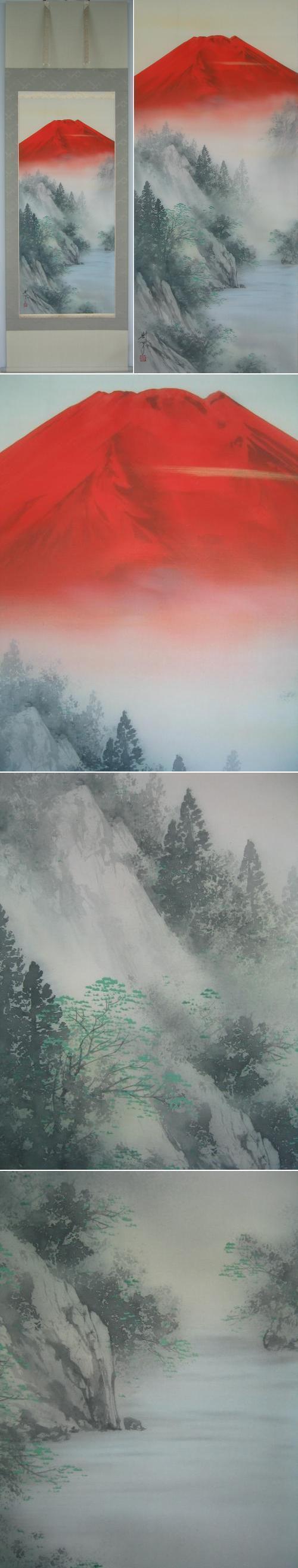 紅色に染まる霊峰富士は吉兆の象徴です。神々しい赤富士を壮大に描きあげた掛軸です。(新品・肉筆)