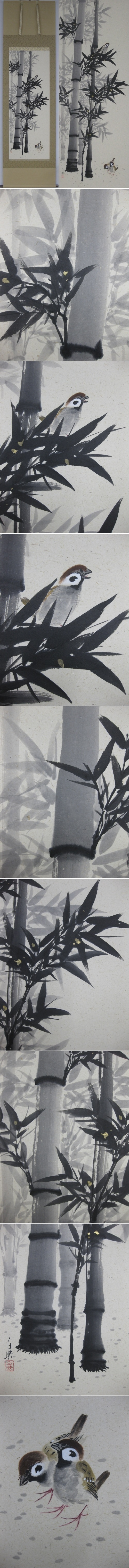 かわいらしい雀たちが戯れる様を生き生きと描いた掛軸です。季節を問わず年中掛けていただけます。(新品・肉筆)