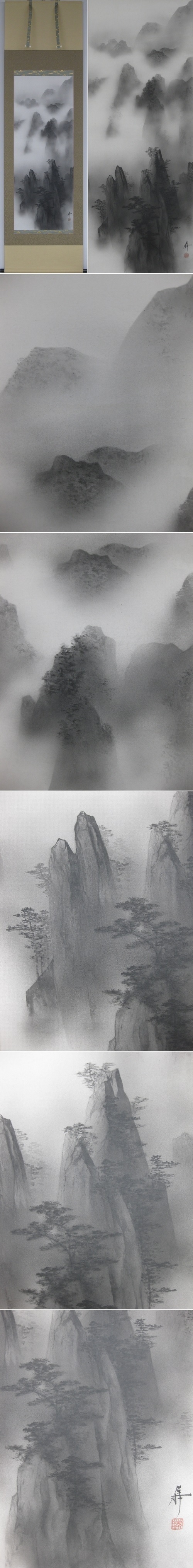 墨の濃淡だけで深山幽谷の一景を見事に描き上げた逸品。雄渾の筆使いが枯淡の趣を重厚壮大に醸し出し雄大な自然を表した掛軸です。(新品・肉筆)
