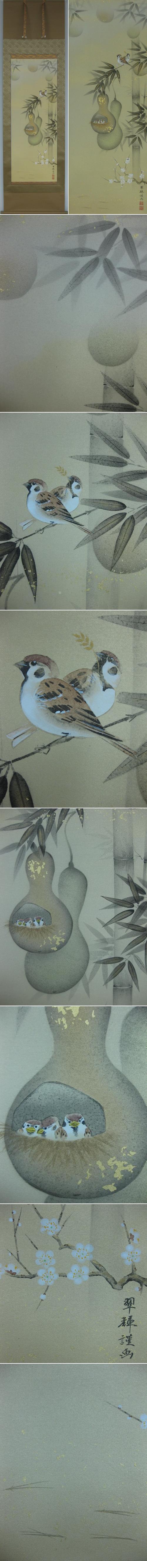 六つの瓢箪すなわち六瓢は無病息災に通じる縁起題材で雀は厄難をついばみ福運を運ぶ吉鳥です。おめでたい松竹梅も描かれている開運画の逸品です。(新品・肉筆)