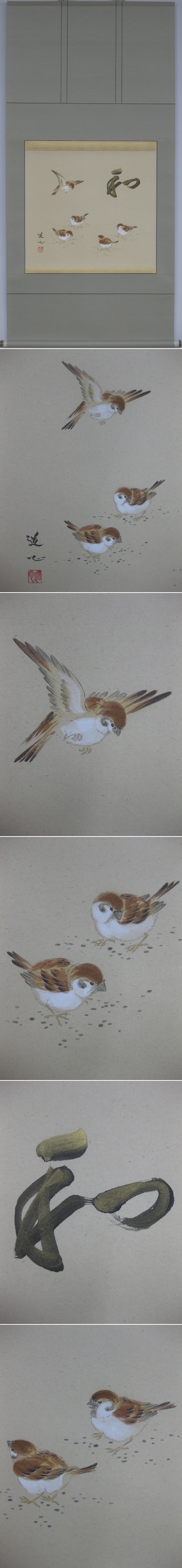 無心に戯れる雀に調和,和やか,などの意味がある「和」の文字が書かれたモダンな掛軸です。(新品・肉筆)