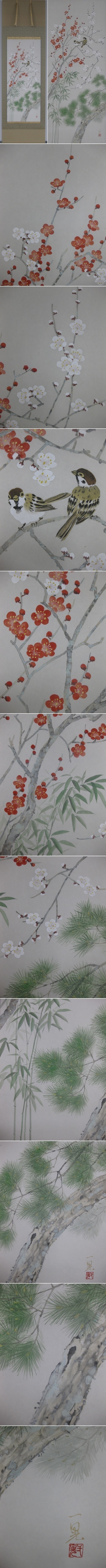 古来より縁起の良い絵柄として親しまれている歳寒三友の松竹梅と悪い虫を食べて駆除してくれるという「益鳥」として縁起が良いとされる雀が描かれています。さらに雀は繁殖力が絶大で「子孫繁栄」の意味もあります。ご家族の家運隆盛を願ってこの掛軸を是非お掛けください。(新品・肉筆) |