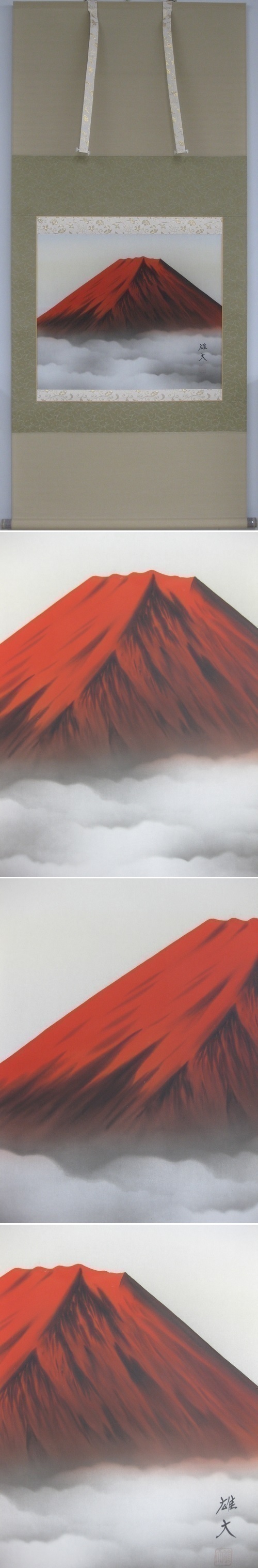 霊峰が真紅に染まる神秘の自然現象に世紀の吉兆を見る。金運上昇の題材としても知られる希少な一景を神々しい趣そのままに表現した掛軸です。(新品・肉筆)