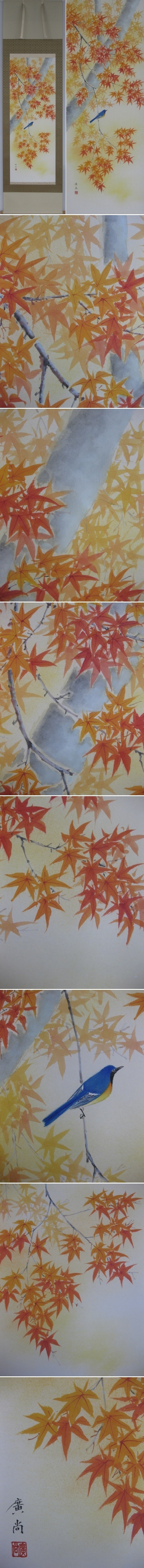 燃え立つような鮮やかな色で染め上げる紅葉の枝にとまる小鳥は,実り豊かなこの季節をとても楽しんでいるようです。(新品・肉筆)