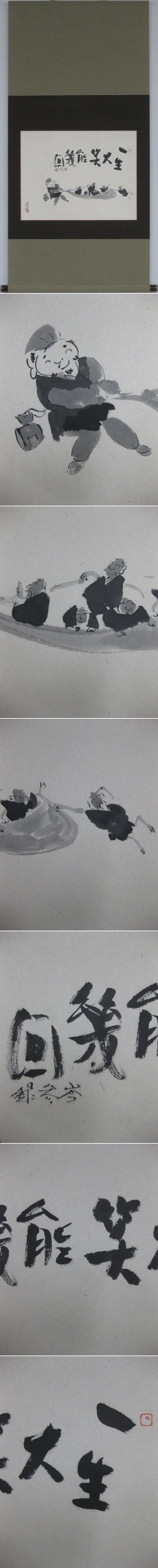 一生大笑能幾回(一生の内で大声で笑えることが何回あるであろうか)を意味した掛軸です。小さい床の間(半間床)やタペストリー感覚でマンションの方でもお気軽に年中掛けていただけるモダンな掛軸です。(新品・肉筆)