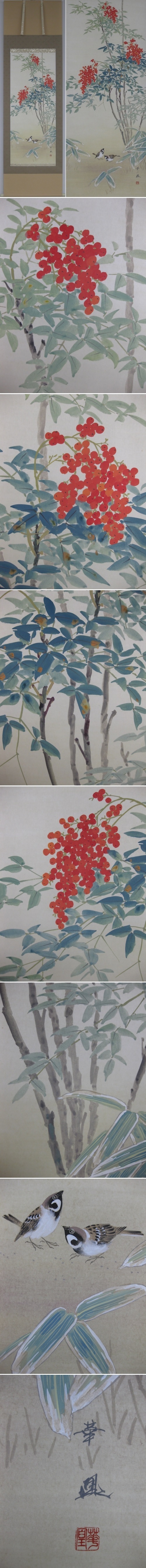 南天は古くから病難や厄災を退ける力があるといわれ,鬼門除けとして好んで植えられてきました。難をついばみ福をもたらす雀。ご家族の無病息災と家運隆盛を願う縁起図です。(新品・肉筆) |