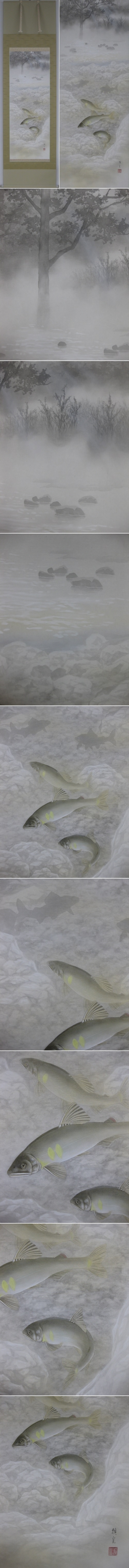 渓流の清らかな水の流れに優雅に泳ぐ鮎が,床の間に爽やかな涼感を感じさせてくれる掛軸です。(新品・肉筆)