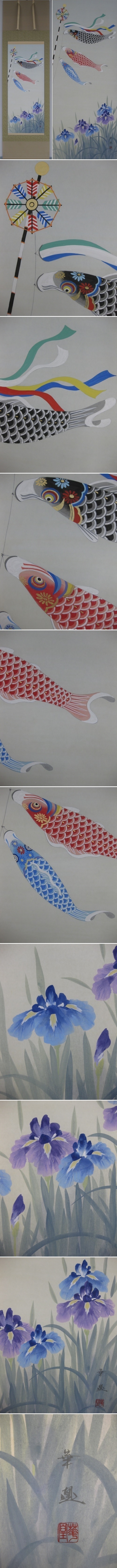 鯉幟を飾ることができないご尊家に大変重宝される掛け軸です。菖蒲は「勝負」「尚武」に通じることから難事に対して打ち勝つといわれる縁起図でもあります。端午の節句掛けにふさわしい逸品です。(新品・肉筆) |