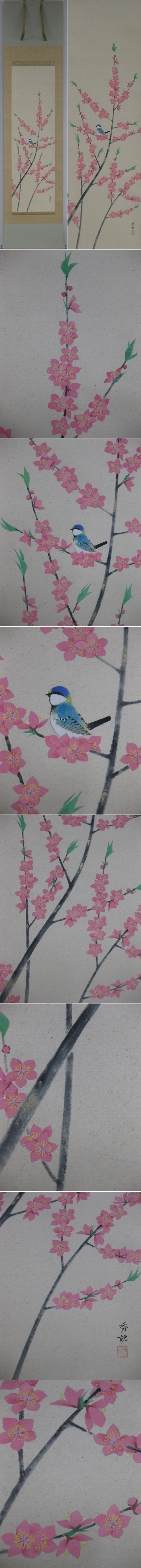 桃の鮮やかな紅色が春の床の間を華やかに演出してくれます。ひな人形を飾られた床の間にお掛けいただければ,より一層お部屋が華やかになりますね。(新品・肉筆)