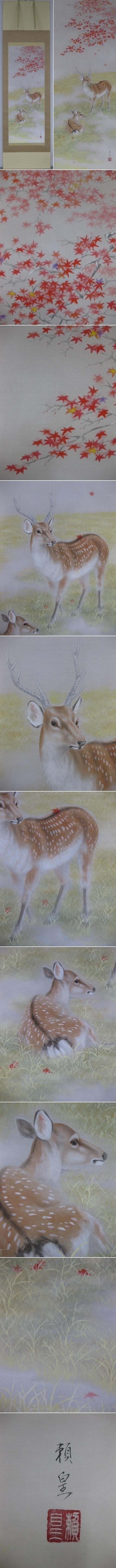 色鮮やかに染まった紅葉の下で,仲睦まじい夫婦の鹿がこの季節を楽しんでいるように微笑ましく描かれています。(新品・肉筆)