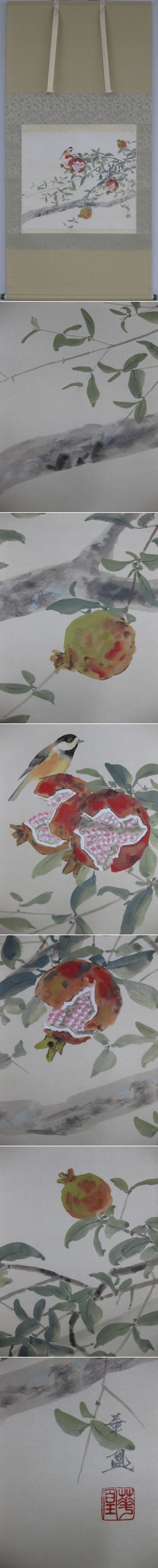 柘榴の実が徐々に熟していき,一羽の小鳥が柘榴に羽を休めます。静寂に包まれる哀愁あふれる秋の情景をあますところなく表現した逸品です。(新品・肉筆) |