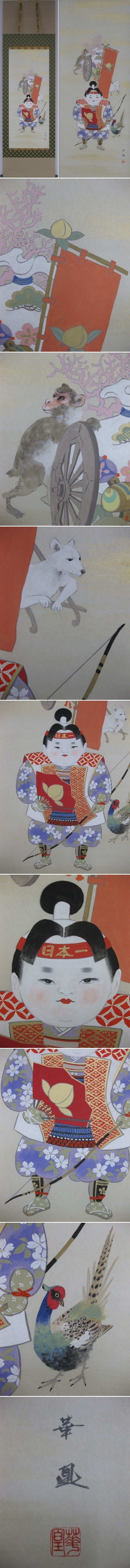 猿,犬,雉を従えて鬼ヶ島へ鬼退治へと向かう桃太郎。その凛々しく勇壮な姿に,わが子の逞しい姿を重ねます。端午の節句やお子様の誕生日をより一層格調高く彩る名画です。(新品・肉筆) |