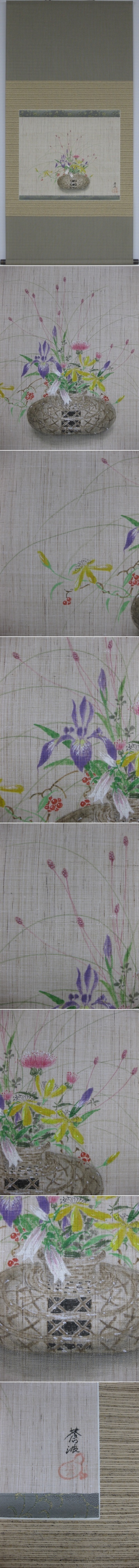 モダンな表装の掛軸に,あやめ,ビヨウヤナギ,サルトリイバラ,ワレモコウ,アザミ,ホタルブクロが描かれています。春から秋にかけて掛けていただけます。(新品・肉筆)