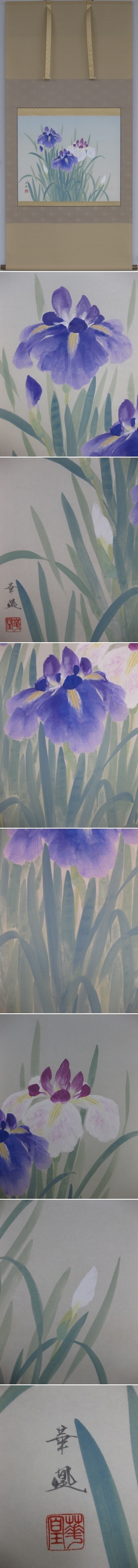 菖蒲の葉は剣のように力強く「尚武」、「勝負」に通じ、その芳香は邪気をはらうといわれております。季節の掛軸としても,また五月人形を飾られた床の間にお掛けいただければ,より一層お部屋を華やかに演出いたします。(新品・肉筆) |