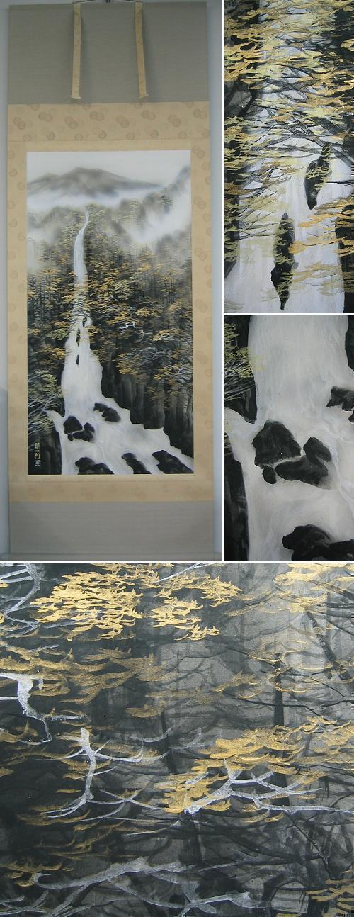 遠景の山、近景の樹、そしてその間を流れる滝が神秘的にえがかれている大幅の大作です。(新品・肉筆)