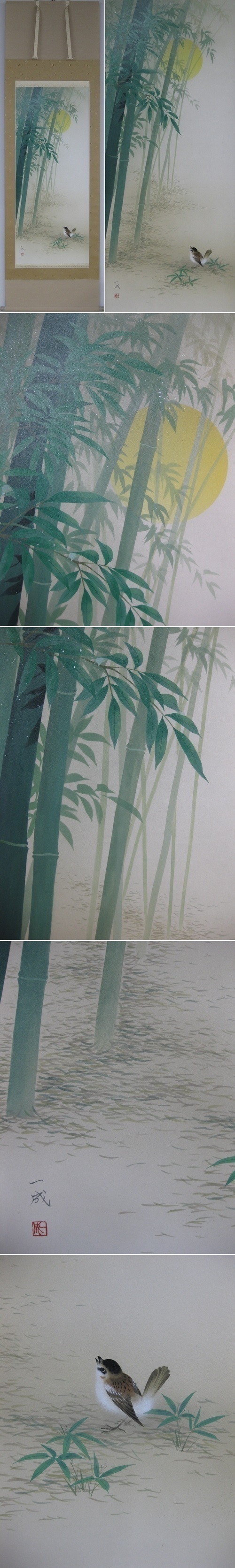 松に鶴,梅に鶯と言う様に,竹と言えば雀が伝統的な日本画の構図です。松梅とともに最吉木の象徴の一つに挙げられる竹に愛らしい雀が月を眺めてるような心和む作品です。(新品・肉筆) |