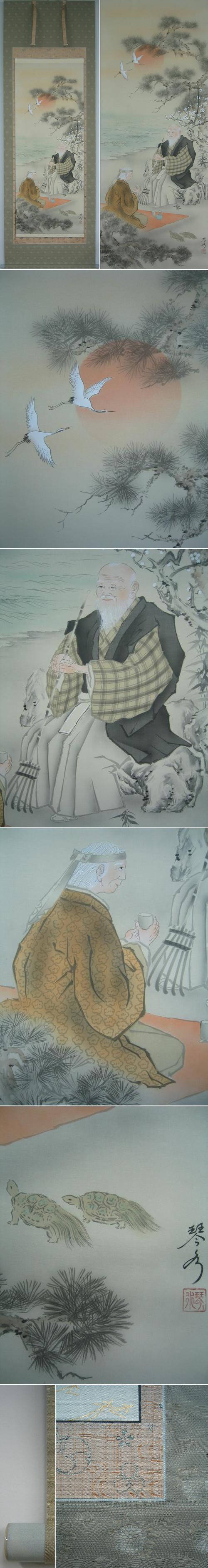 生命を象徴する旭日を背に,千年の長寿を謳う老松。舞い来る丹頂鶴,万年の長寿を誇る神亀にかこまれ,仲睦まじく寄り添う夫婦の姿は家庭円満の根源を表し,変わらぬ幸福を約束するものです。本表装の豪華な仕立てになっております。(新品・肉筆)