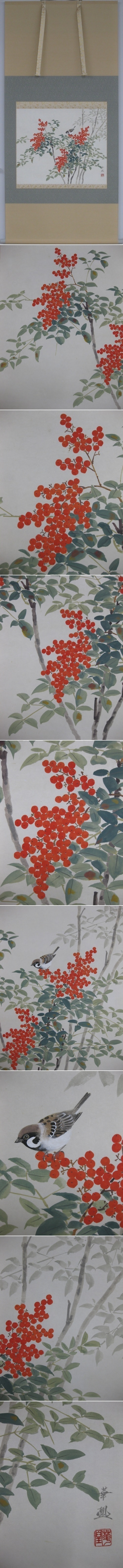 「難を転ずる」の意味がある南天と、難をついばみ福をもたらす吉鳥の雀が描かれておりとても縁起の良い掛け軸です。(新品・肉筆) |
