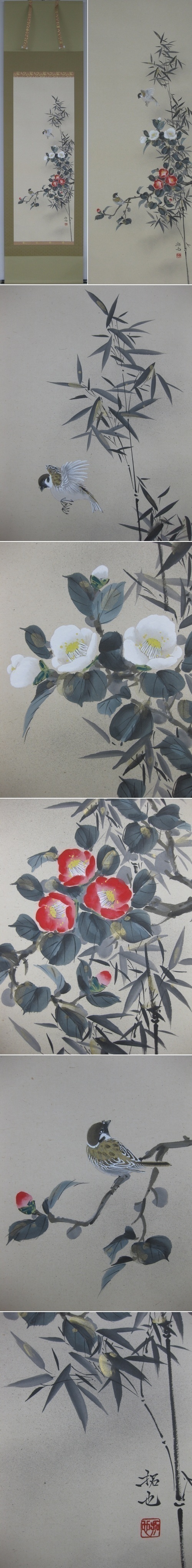コメント 紅白の椿がしっとりとした色彩で描かれた上品な掛軸です。(新品・肉筆)