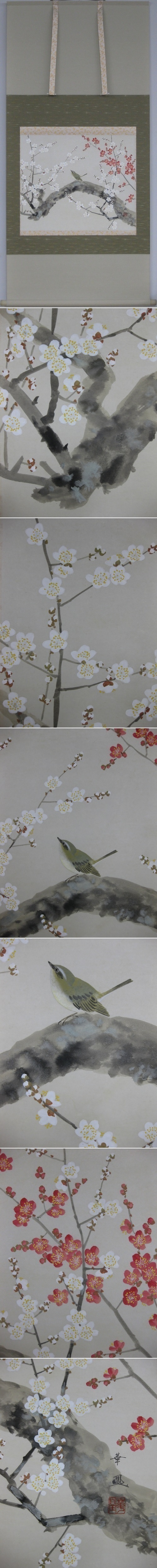 紅白の彩りで新春の題材として珍重される梅花と,その枝で羽を休める鴬は初音で一年の吉凶を占ったという。可憐な花の紅白の彩りが吉祥により一層の華やかさを添える名品です。(新品・肉筆) |