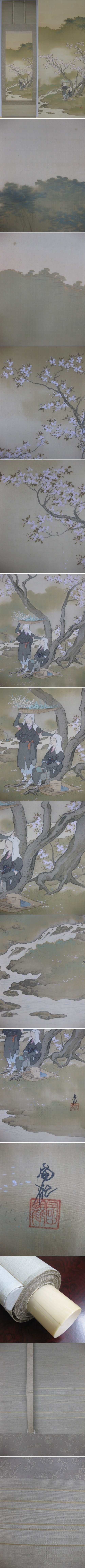本紙(写真2.3段目参照)に薄い汚れありますが鑑賞には気にならない程度です。表装は元布(天地に金糸の柄(写真下から1.2段眼参照)があります。)を使って仕立て直してありますので状態は良好です。(手打ち表装) |