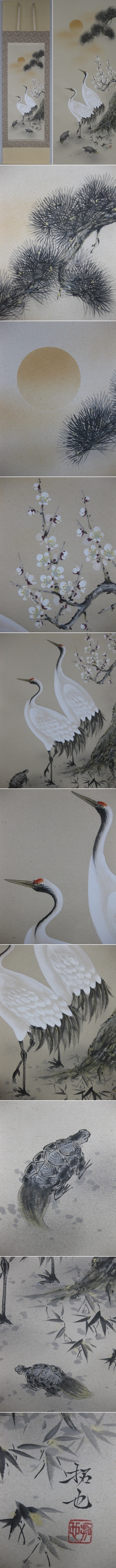 お正月をはじめあらゆる慶祝の席(還暦、喜寿、米寿、白寿、婚礼、結納等)に華やぎを演出する、格調ある松竹梅鶴亀の掛軸です。(新品・肉筆)