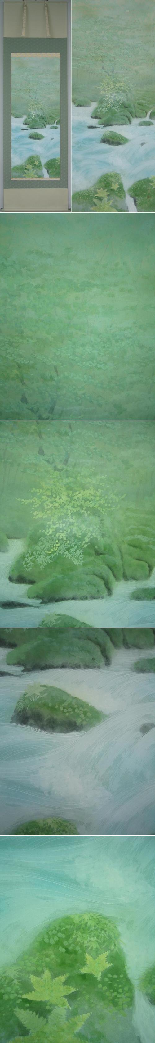 奥入瀬渓流の水の流れが躍動感あふれる筆致で描かれています。夏の床の間にぴったりな爽やかな掛軸です。(新品・肉筆)