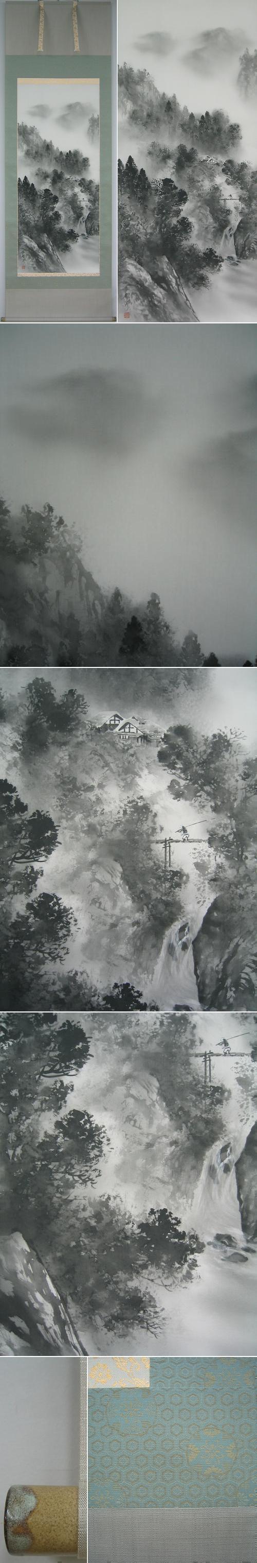 遥かに望む山々から麓まで,美しく描かれた渓谷の一景。大自然が織りなす美しい営みを雄渾の筆使いで描き上げた情緒豊かな掛軸です。(新品・肉筆) |