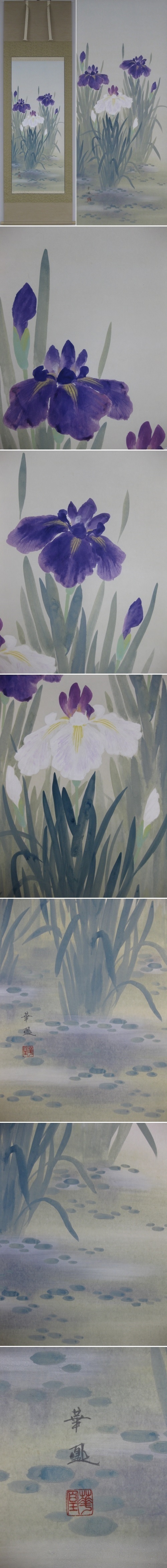 色鮮やかな菖蒲と風情あふれる情景を描いた爽やかな掛軸です。菖蒲は「勝負」「尚武」に通じることから難事に対して打ち勝つといわれる縁起図でもあります。(新品・肉筆) |