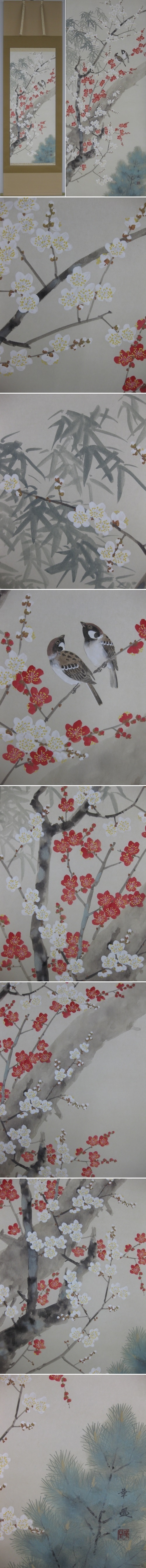 「歳寒の三友」と称される松・竹・梅が吉祥を彩る名構図。厄難をついばみ開運を運ぶ吉鳥の雀が集い,めでたさ極まりない掛軸です。(新品・肉筆) |