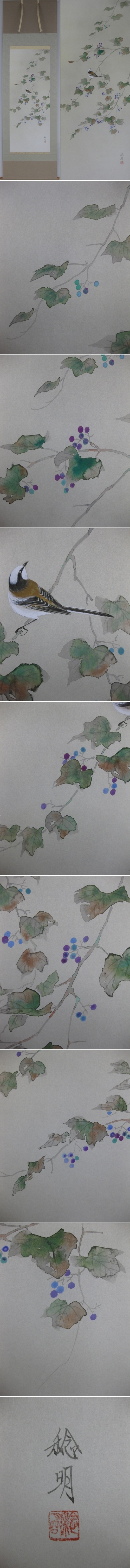 色鮮やかに青く染まった野葡萄の枝に小鳥が羽を休めます。静寂に包まれる秋の風趣をしっとりと感じさせる作品です。(新品・肉筆) |