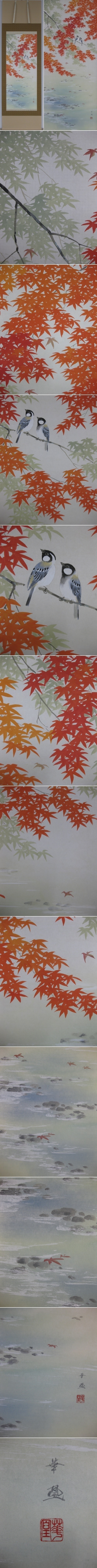 艶やかに色づいていく紅葉は晩秋の代表的な情景。二羽の小鳥が羽を休める,端麗な色使いと精緻な筆致が冴える味わい深い秋の掛軸です。(新品・肉筆) |