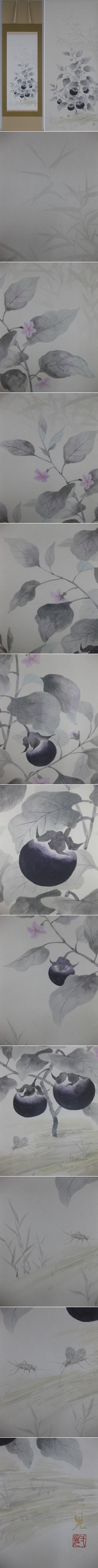 色づきはじめた茄子の下スズムシの鳴き声が爽やかな秋の季節を感じさせます。さらに深まりゆく季節に思いを馳せながら貴家の床の間に是非ともお掛け下さい。(新品・肉筆)