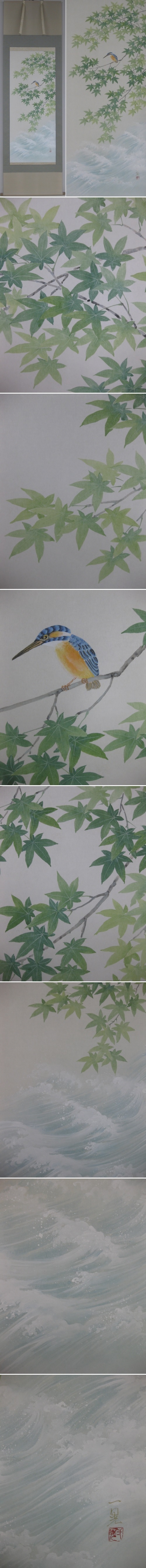 彩りも鮮やかなカワセミは羽の色から,「翡翠」とも呼ばれる夏の代表的な鳥です。涼しげな水辺の一瞬を,清涼感あふれる色調で描いた絶妙な構図の作品です。(新品・肉筆)