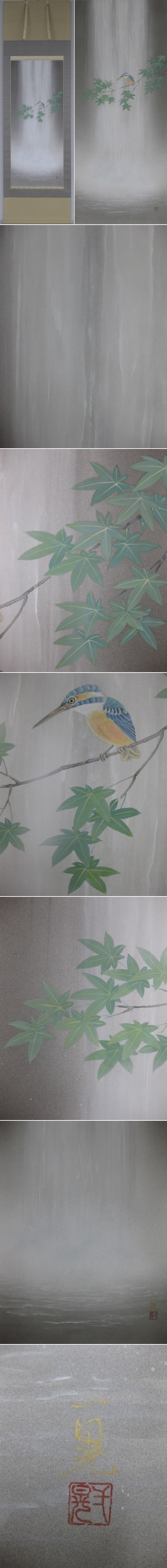 彩りも鮮やかなカワセミは羽の色から,「翡翠」とも呼ばれる夏の代表的な鳥です。涼しげな滝を背景に,清涼感あふれる色調で描いた絶妙な構図の作品です。(新品・肉筆)