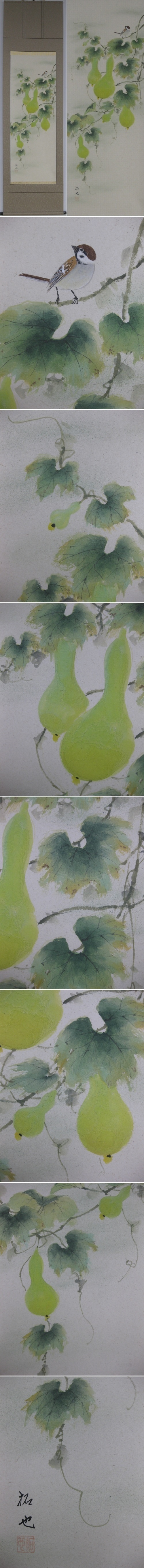 瓢箪が六つ実った「六瓢」は「無病」をあらわし,病魔除けの霊力が宿ることにより,健康長寿を授けるといわれています。構図のまとまり感はもちろんの事,和紙に描かれたこの作品は奥田画伯ならではの筆致が表現された掛軸です。(新品・肉筆) |